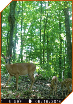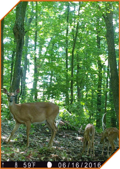 Lenise and I sprayed herbicide on the meadow, the road to Roy’s area and around the lick area, skipped the slopes to the slough, then from in front of Kris/Jon’s stand to the east line. We then sprayed from the “Y” to just before John’s plantings on the road. The apple tree looks healthy and growing. We also circled the cabin with the sprayer. We weren’t able to spray the road to Rols’ stand/north line. We had to get the sprayer back to the rental place. We changed out the memory sticks in our trail cams and here are a few of the pictures. There were MANY of deer, mostly young does, one fawn, a few button bucks, two, two year olds and various critters.The pictures are a month off and should read June, not May. Lenise’s stand is in the right background about 60 yards distant.Young buck in velvet…Curious bandit…Another bandit, maybe more…The black squirrels are back…Surprise, looks who came for a late night dinner; note time stamp. Minnesota DNR states it’s bobcat, but a comparison image says different. What do you think?